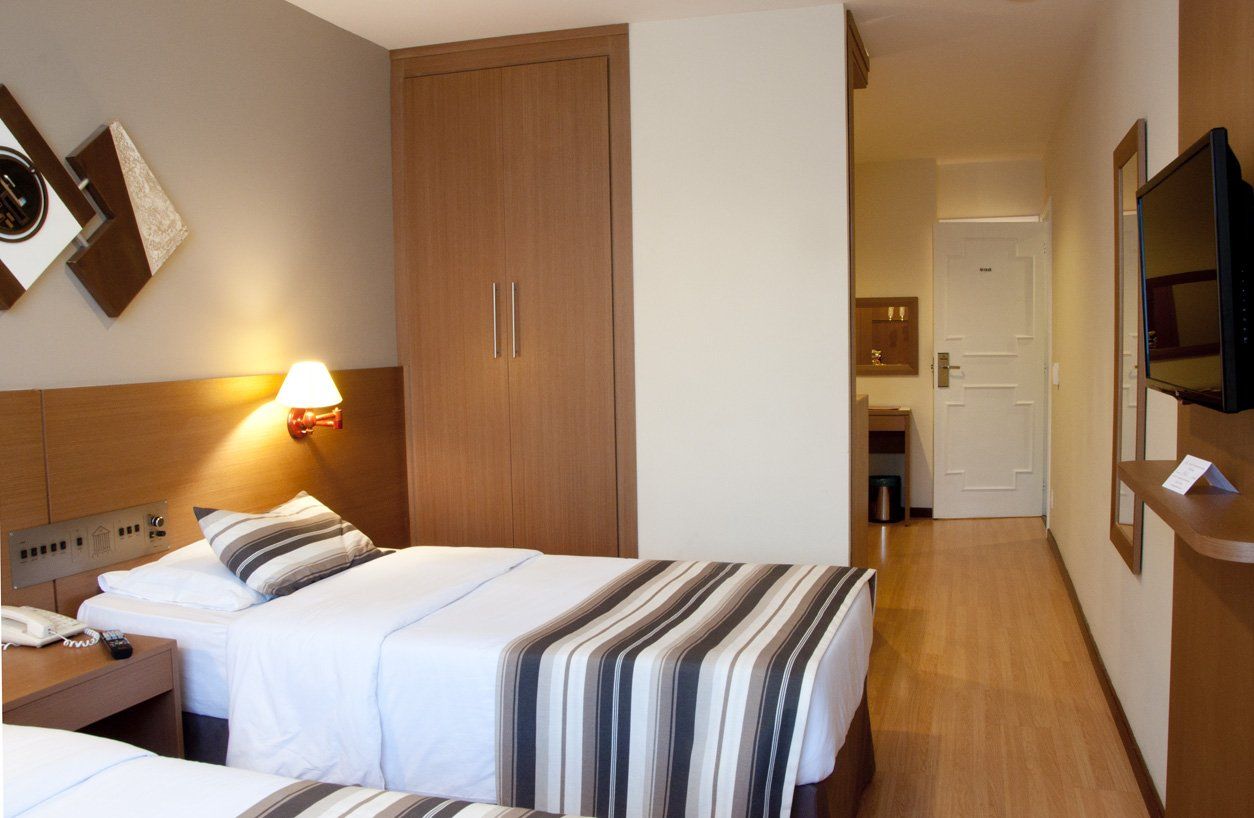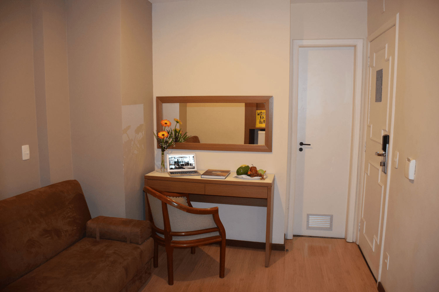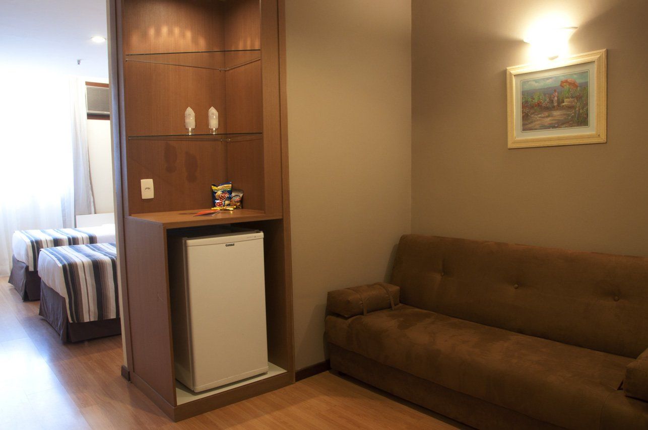 Medindo 25 m², esta suíte dispõe de duas camas de solteiro e TV de tela plana com canais a cabo, ar-condicionado, frigobar e sala com sofá e mesa de trabalho.